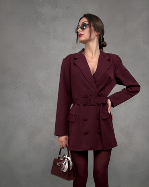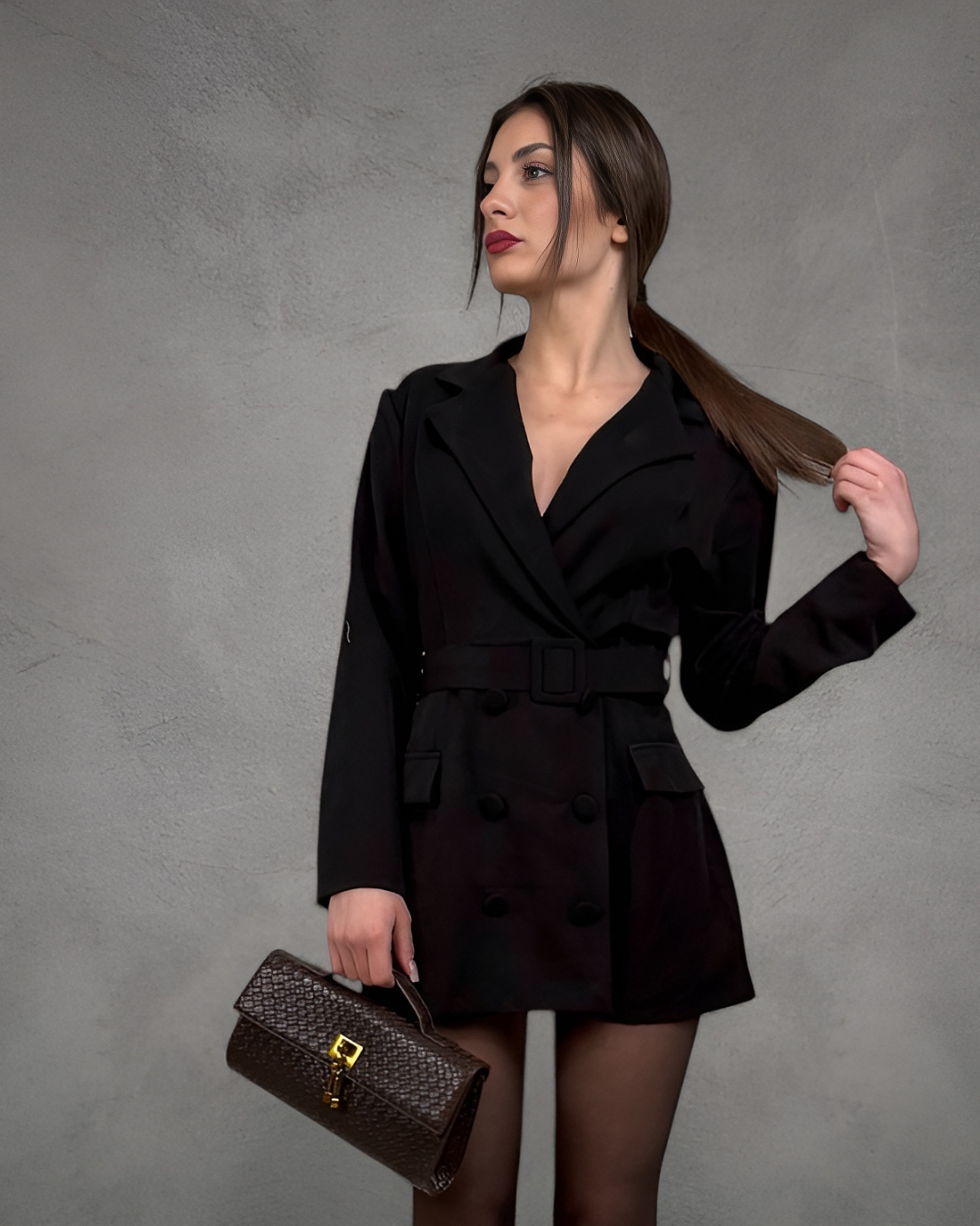 Abito elegante dallo stile sartoriale, con linea strutturata e scollo incrociato che valorizza la figura. Vestibilità femminile e raffinata, perfetta per look decisi e sofisticati.