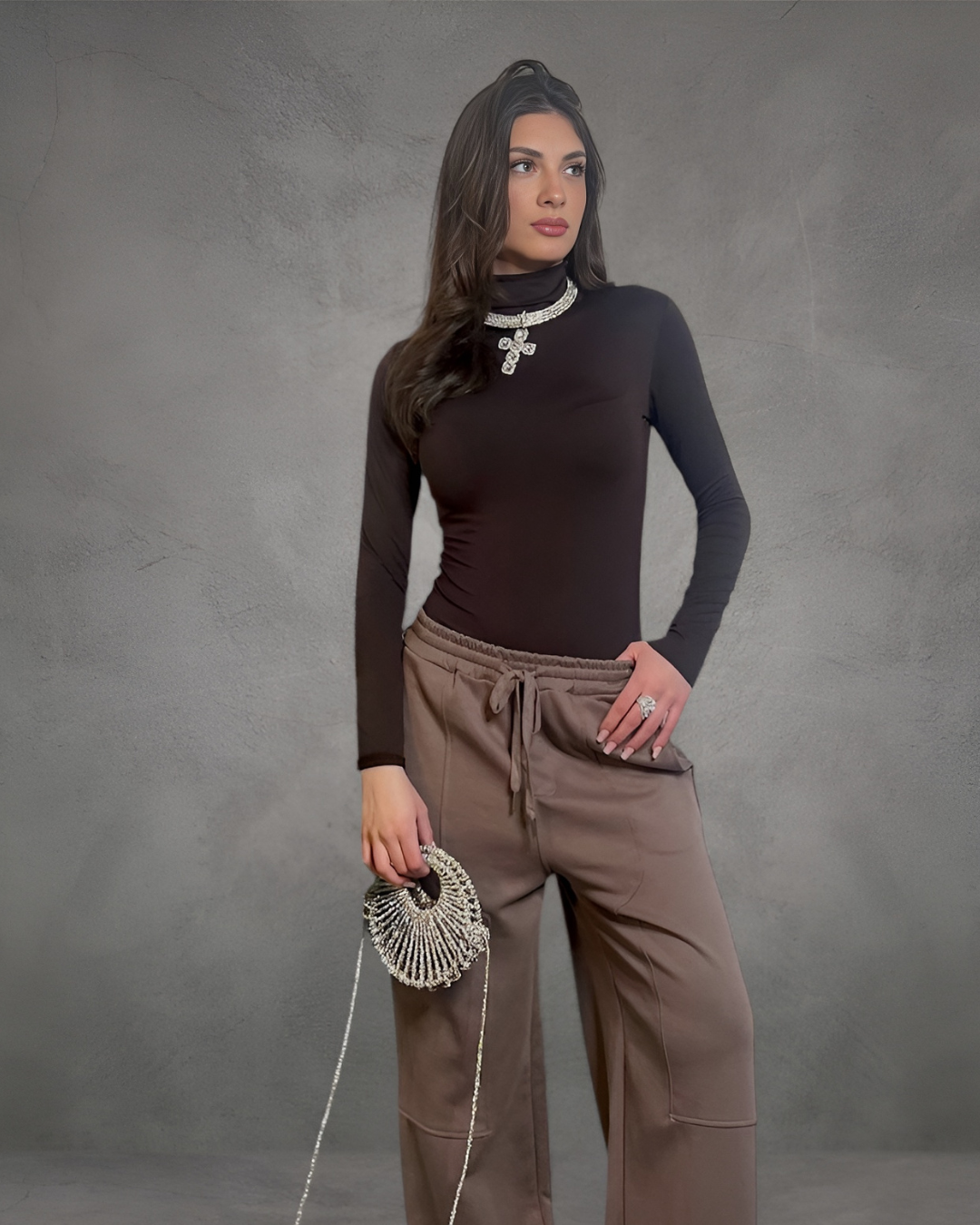 Maglia elasticizzata dal taglio aderente con collo alto, morbida e confortevole. Taglia unica, veste perfettamente dalla S alla L, ideale per un look versatile e raffinato in ogni stagione.