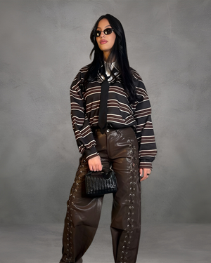 Pantalone in ecopelle dal design moderno, caratterizzato da dettagli intrecciati con lacci che aggiungono un tocco deciso e femminile. Morbido, confortevole e perfetto per creare look audaci e di tendenza, dalla sera al casual chic.