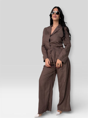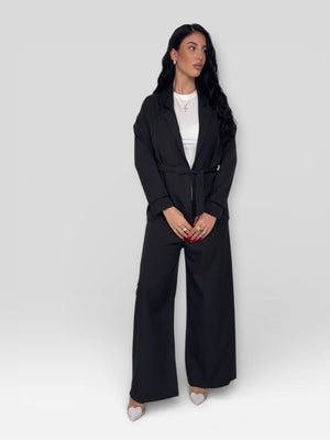 Tailleur due pezzi in tessuto leggero, composto da giacca con cintura in vita e pantalone a gamba ampia. Elegante, fluido e confortevole, ideale per un look raffinato e versatile.