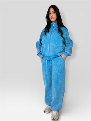 Tuta dal design contemporaneo composta da felpa con zip e pantaloni a gamba ampia. Il tessuto morbido con effetto washed dona un look casual e di tendenza, perfetto per outfit street e tempo libero.