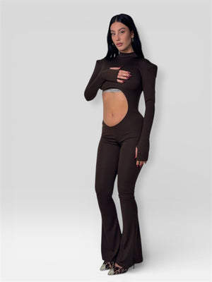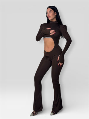 La tuta Cocoa  è realizzata in tessuto elasticizzato color cioccolato e presenta un ampio cut‑out frontale che valorizza il punto vita, spalle strutturate e maniche lunghe con dettaglio passapollice.